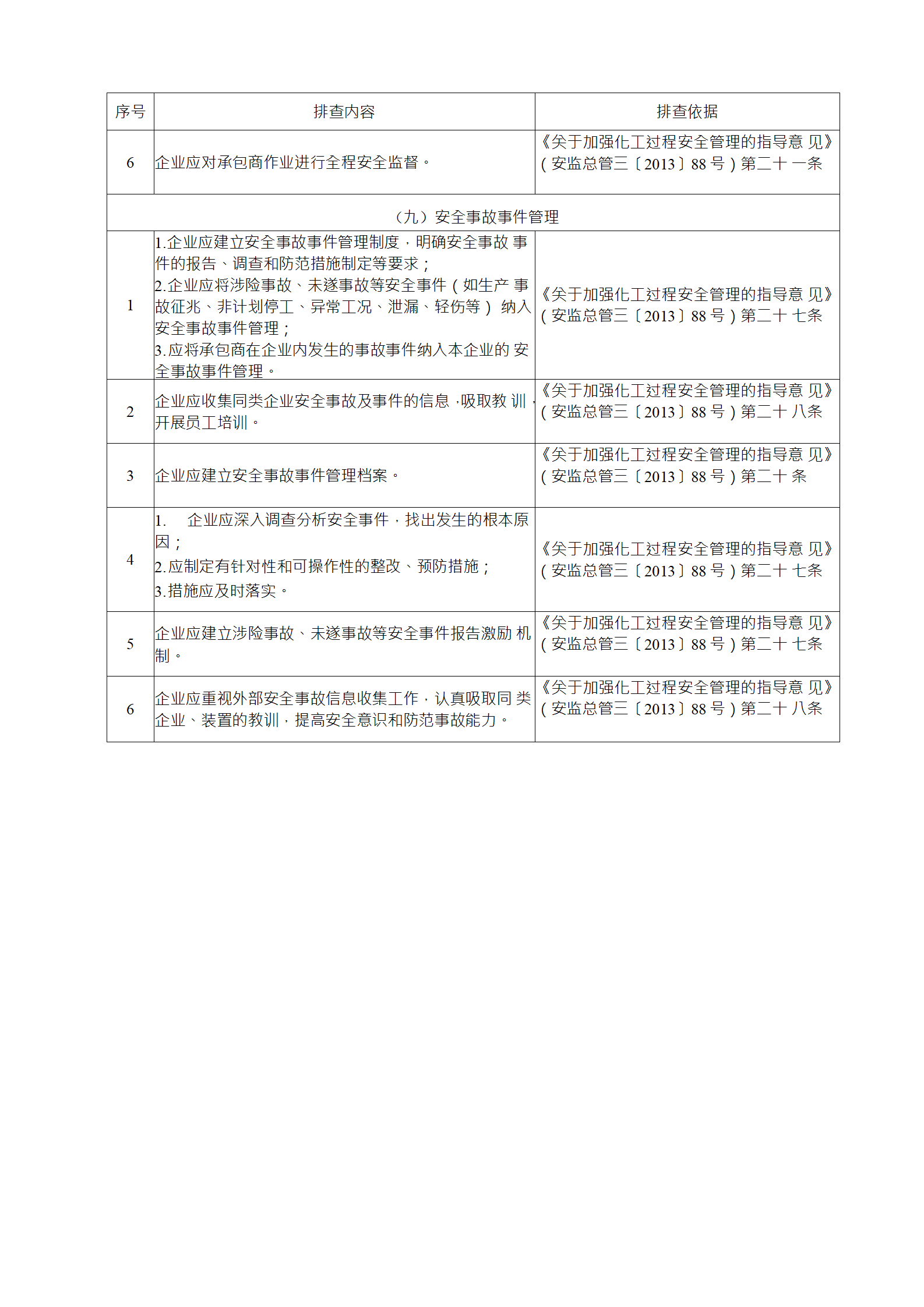 (2)綜合性排查是指以安全生產(chǎn)責(zé)任制、各項(xiàng)專業(yè)管理制 度、安全生產(chǎn)管理制度和化工過(guò)程安全管理各要素落實(shí)情況為重點(diǎn)開(kāi)展的全面檢查;