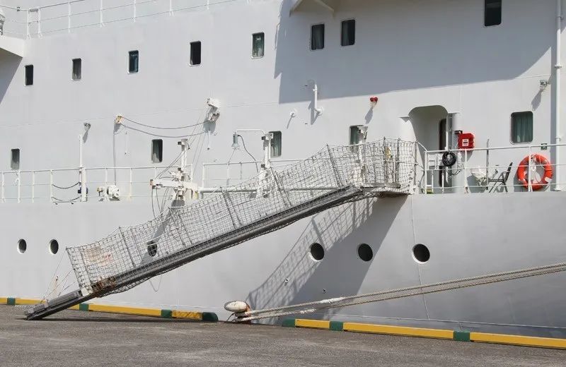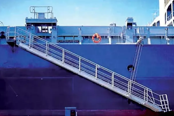根據(jù)新生效的GB/T11701-2021《船用舷梯的基本規(guī)定》(3月1日起施行),舷梯主要分為兩類: (1)旋轉(zhuǎn)平臺式舷梯 單節(jié)舷梯、多節(jié)舷梯或伸縮舷梯的結(jié)構(gòu)與上面的旋轉(zhuǎn)平臺鉸接,可在船與登梯底面之間改變方向和傾斜角度。舷梯可用鋼絲繩或鏈從較低的(各)懸掛點掛住,或用固定在舷梯底部滾柱支持。 (2)固定平臺式舷梯 單節(jié)舷梯、多節(jié)舷梯或伸縮舷梯的結(jié)構(gòu)與上面的固定平臺鉸接,可在船和登梯底面之間改變傾斜角度。舷梯用鋼絲繩或鏈從較低的(各)懸掛點掛住,單獨使用的引航員舷梯采用此固定平臺式舷梯。 根據(jù)SOLAS第II-1章第3-9條款,凡是2010年1月1日及以后建造的船舶,必須在船上安裝經(jīng)認(rèn)可的登/離船設(shè)施,以備在港口或港口相關(guān)操作時使用。 該登/離船設(shè)施必須根據(jù)MSC.1/Circ.1331通函的要求進行建造、測試、安裝及維護,主要包括以下八點要求: (1)登/離船設(shè)施應(yīng)遠(yuǎn)離工作區(qū)域以及貨物或其它物體懸掛吊裝時可能通過上方的區(qū)域,該登/離船設(shè)施的目的和使用方式與引水員登 / 離船裝置是不同的; (2)應(yīng)提供足夠的照明,以照亮登/離船設(shè)施、甲板上人員登/離船和裝置控制的位置; (3)當(dāng)?shù)?離船裝置在使用時,在其附近應(yīng)備有一只帶有自亮浮燈和救生浮索的救生圈(注意這里是要求一只救生圈既配備有自亮浮燈又配備有救生浮索,并且處于隨時可用狀態(tài)); (4)每部舷梯應(yīng)具有在其最大操作傾斜角時,下平臺在最輕載水線以上不大于600mm的高度; (5)在每部舷梯或跳板梯的兩端應(yīng)設(shè)置一塊標(biāo)記牌,以清楚顯示安全操作和負(fù)荷限制,包括最大和最小允許設(shè)計傾斜角、設(shè)計負(fù)荷、最大底端板負(fù)荷等,如果最大操作負(fù)荷小于設(shè)計負(fù)荷,則最大操作負(fù)荷也應(yīng)顯示在標(biāo)記牌上; (6)跳板梯使用時安放水平傾斜角不應(yīng)大于30度和舷梯使用時水平傾斜角不應(yīng)大于55度; (7)在人員從登/離船設(shè)施或船舶與碼頭之間可能墜落的舷梯下應(yīng)安放安全網(wǎng); (8)正確設(shè)置舷梯下平臺的安全插銷。 收放前:應(yīng)對升降機械、鋼絲繩、滑車轉(zhuǎn)盤平臺支架等進行檢查,確認(rèn)設(shè)備完好,鋼絲、卷筒、吊梁無障礙后方可作業(yè)。 收放過程中: (1)船靠離碼頭收放舷梯過程中,應(yīng)有專人指揮,作業(yè)人員默契配合。在浮動的梯子上進行收起、安裝欄桿、護繩作業(yè)時,應(yīng)先檢查平臺支架是否已可靠支好,并使用止蕩索,上舷梯操作人員必須系好安全帶,穿好救生衣。 (2)舷梯落岸下踏板應(yīng)避開障礙物,安放平穩(wěn),嚴(yán)禁扭曲。吊梁、鏈條要注意絞高或安放妥當(dāng),以免碰頭和妨礙上下船。 (3)由于潮夕、裝卸貨、碼頭環(huán)境等因素影響,舷梯不能放置碼頭時,要注意隨時調(diào)整舷梯高度。當(dāng)舷梯下踏板離碼頭較高較遠(yuǎn)時,不允許勉強上下。梯口值班人員負(fù)責(zé)調(diào)整舷梯和提醒上下人員注意安全,必要時應(yīng)按規(guī)定加裝橋梯。 (4)由于漲落潮、移泊等原因需要松緊纜繩時,應(yīng)絞起舷梯,收起橋梯,或?qū)H丝春锰菘诮谷藛T上下。在無法使用舷梯時,要正確地搭設(shè)橋梯,必須綁扎牢固、裝妥扶手、掛好安全網(wǎng)后人員方可上下。禁止從船舷直接跳上碼頭,或從碼頭直接跳上船。 (5)舷梯、橋梯必須按規(guī)定張掛安全網(wǎng)。舷梯、橋梯處應(yīng)有防墜落、防滑等安全指示標(biāo)志。舷梯、橋梯的扶手、扶繩、階梯必須保持清爽、干凈、牢固,便于上下人員抓牢、踏實。 (6)禁止用舷梯吊運物品,禁止超載。