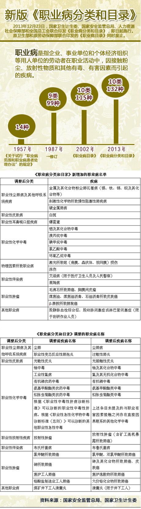 摘要: 2013年12月23日,國(guó)家衛(wèi)生計(jì)生委、國(guó)家安全監(jiān)管總局、人力資源社會(huì)保障部和全國(guó)總工會(huì)聯(lián)合印發(fā)《職業(yè)病分類和目錄》,即日起施行。原衛(wèi)生部和原勞動(dòng)保障部聯(lián)合印發(fā)的《職業(yè)病目錄》同時(shí)廢止。