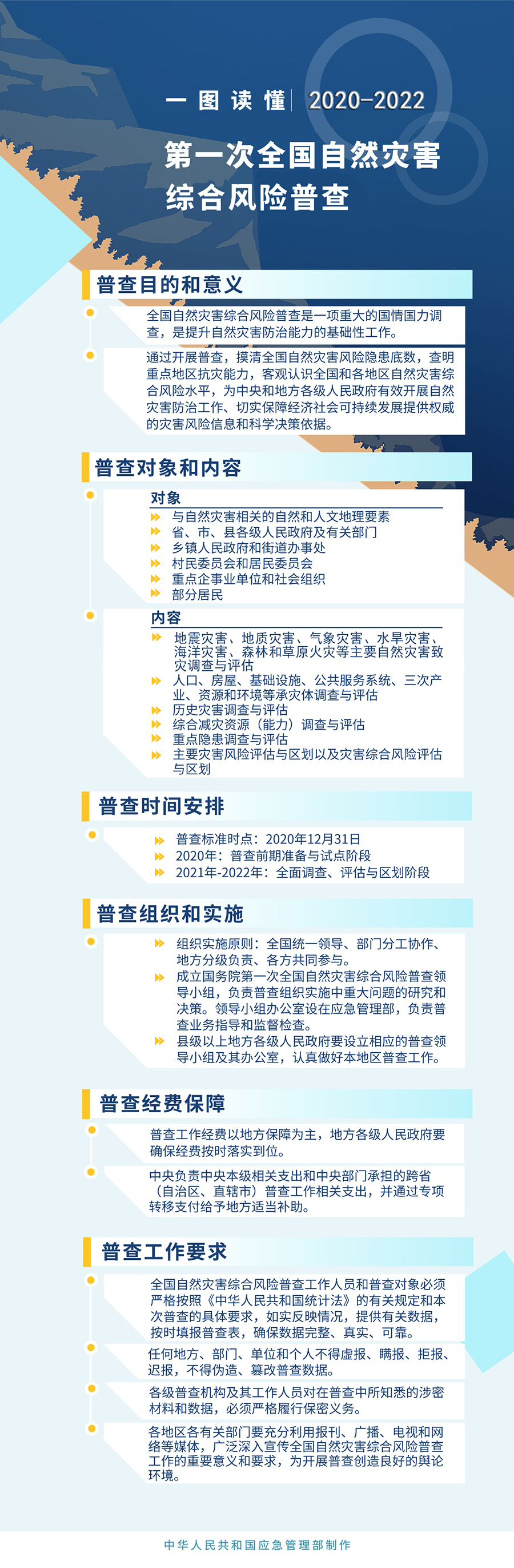 近日,國務(wù)院辦公廳下發(fā)了《關(guān)于開展第一次全國自然災(zāi)害綜合風(fēng)險(xiǎn)普查的通知》(簡稱《通知》),定于2020年至2022年開展第一次全國自然災(zāi)害綜合風(fēng)險(xiǎn)普查工作,成立國務(wù)院第一次全國自然災(zāi)害綜合風(fēng)險(xiǎn)普查領(lǐng)導(dǎo)小組,領(lǐng)導(dǎo)小組辦公室設(shè)在應(yīng)急管理部,承擔(dān)領(lǐng)導(dǎo)小組的日常工作。本次普查涉及范圍廣、參與部門多、專業(yè)性強(qiáng)、技術(shù)要求高,各實(shí)施主體準(zhǔn)確把握普查技術(shù)思路、技術(shù)路線和技術(shù)特點(diǎn),對(duì)于按時(shí)保質(zhì)完成各項(xiàng)普查任務(wù)至關(guān)重要。為此,第一次全國自然災(zāi)害綜合風(fēng)險(xiǎn)普查技術(shù)組組長、北京師范大學(xué)教授、青海師范大學(xué)校長史培軍就相關(guān)情況進(jìn)行了權(quán)威解讀。