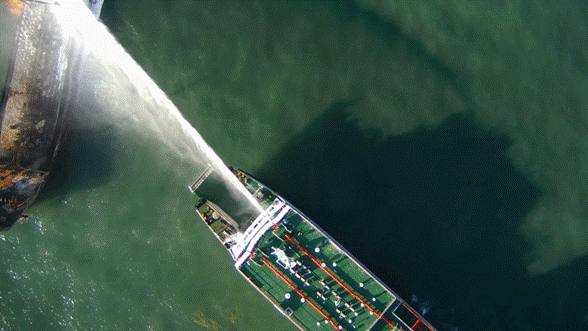 舟山隊(duì)“中化應(yīng)急”號(hào)救援船撲救著火油船
