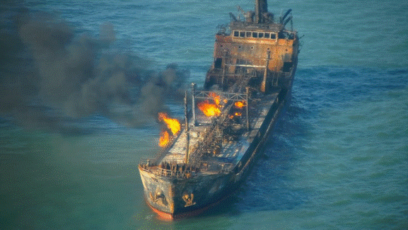 正在燃燒的“隆慶1號(hào)”油船