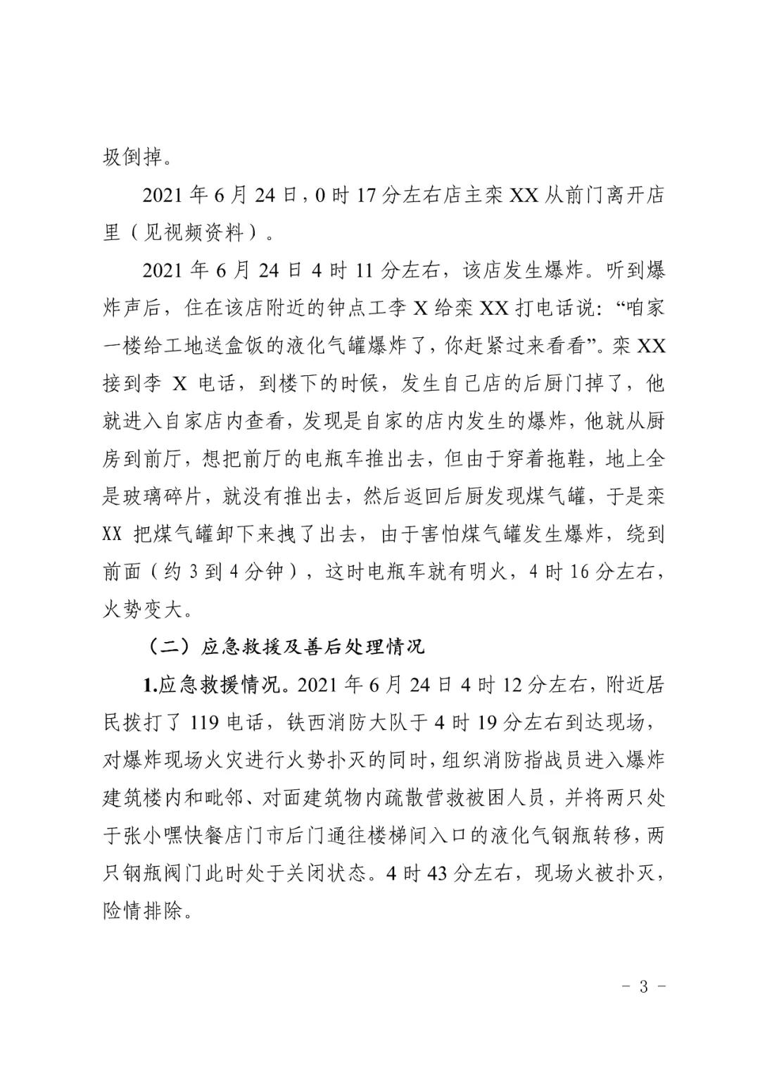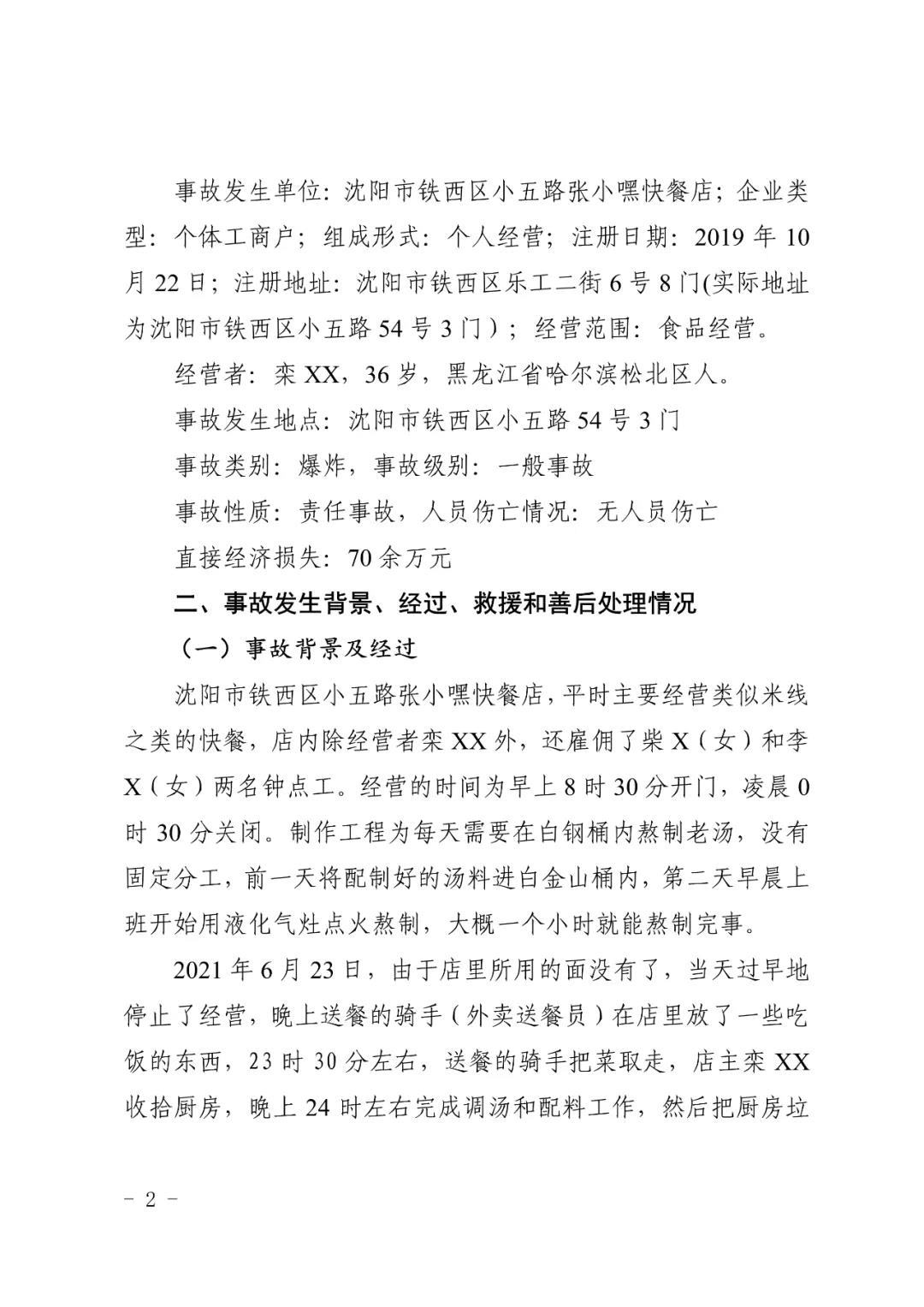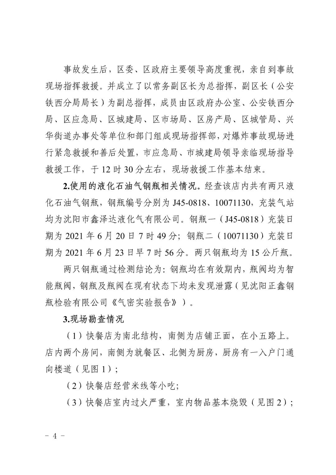 2021 年 6 月 24 日 4 時(shí) 11 分左右,位于沈陽(yáng)市鐵西區(qū)小五路 54 號(hào) 3 門(mén),沈陽(yáng)市鐵西區(qū)小五路張小嘿快餐店內(nèi)發(fā)生液化石油氣泄漏爆炸,無(wú)人員傷亡,直接經(jīng)濟(jì)損失 70 余萬(wàn)元。