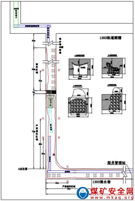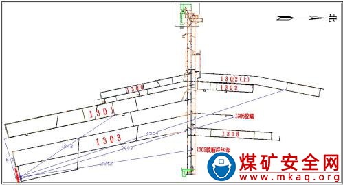 事故當班,綜掘隊和防沖項目部在 1303 工作面泄水巷及 3 號聯(lián)絡巷施工。