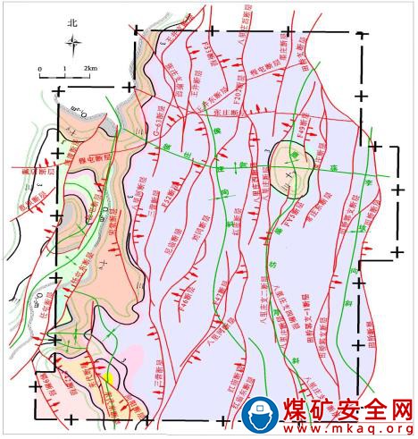山東龍鄆煤業(yè)有限公司前身為山東省鄆城煤礦,位于菏澤市鄆城縣潘渡鎮(zhèn)境內,南距鄆城縣城 6 千米。原隸屬于山東省齊魯新航集團有限責任公司,2006 年 9 月開工建設。2011 年 1 月起,山東省鄆城煤礦由龍礦集團托管。2016 年 6 月,龍礦集團與山東省齊魯新航集團有限責任公司簽訂了《山東省鄆城煤礦移交接管劃轉協(xié)議》,礦井的生產建設主體變更為龍礦集團。2017 年 4 月,礦井正式投產,設計生產能力 240 萬噸/年。2017 年 12 月,礦井更名為山東龍鄆煤業(yè)有限公司(以下簡稱龍鄆煤礦)。2017 年 5~12 月,生產原煤 160 萬噸;2018 年 1~9 月,生產原煤 177.73萬噸。礦井采礦許可證、安全生產許可證、工商營業(yè)執(zhí)照齊全有效。礦井開采條件。井田位于巨野煤田最北端,屬全隱蔽的華北型石炭、二疊系煤田。井田范圍由 20 個拐點坐標圈定,面積 198.3 平方公里,開采標高-450~-1750 米。井田含煤地層為山西組和太原組,其中主采煤層為山西組 3 煤層。井田處于鄆城斷裂、巨野斷裂、曹縣斷裂和汶泗斷裂的“井”字形中間區(qū)內,井田的典型構造特征為斷塊型。井田總體呈走向近南北、傾向東的單斜構造,勘查發(fā)現(xiàn)全井田共有斷層 130 條,其中,一采區(qū) 37 條。見圖 1。