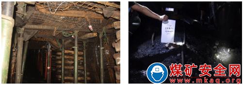 巷道支護系統(tǒng)沒有承受住強動載沖擊。事故巷道沿底板托頂煤掘進,上部為頂煤和泥巖組成的復合頂板,節(jié)理發(fā)育,受到沖擊后易碎脹破壞。從事故現(xiàn)場情況看,礦井按照《煤巷錨桿支護技術規(guī)范》設計的巷道支護,但這次沖擊載荷超過現(xiàn)支護的承載能力,造成事故區(qū)域巷道破壞。