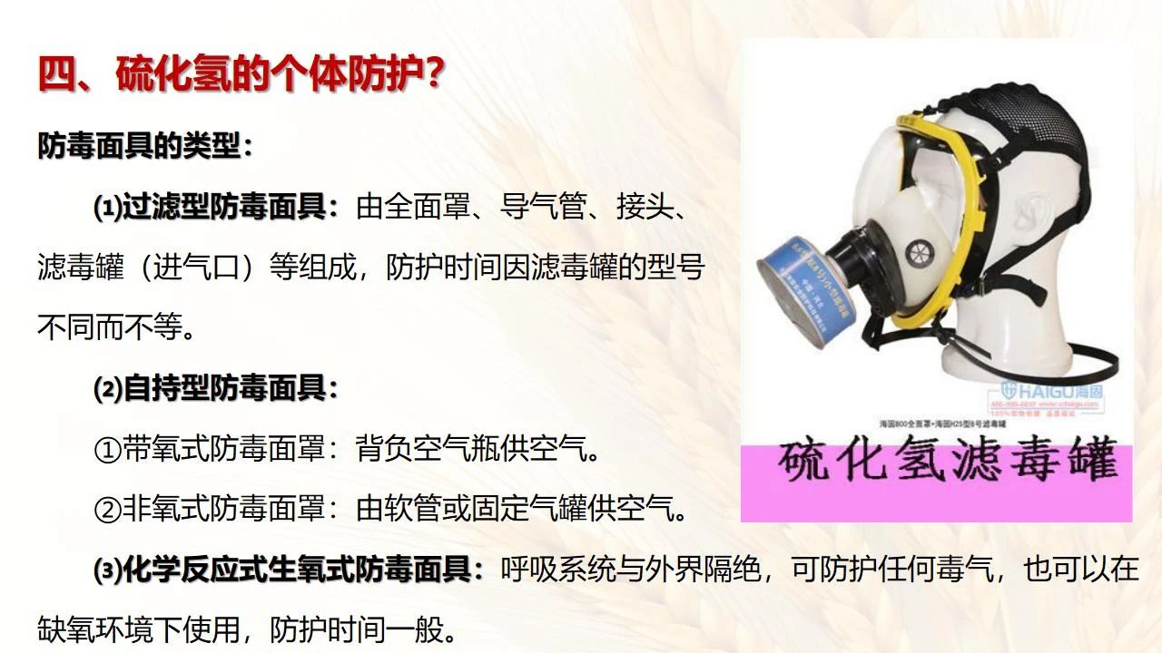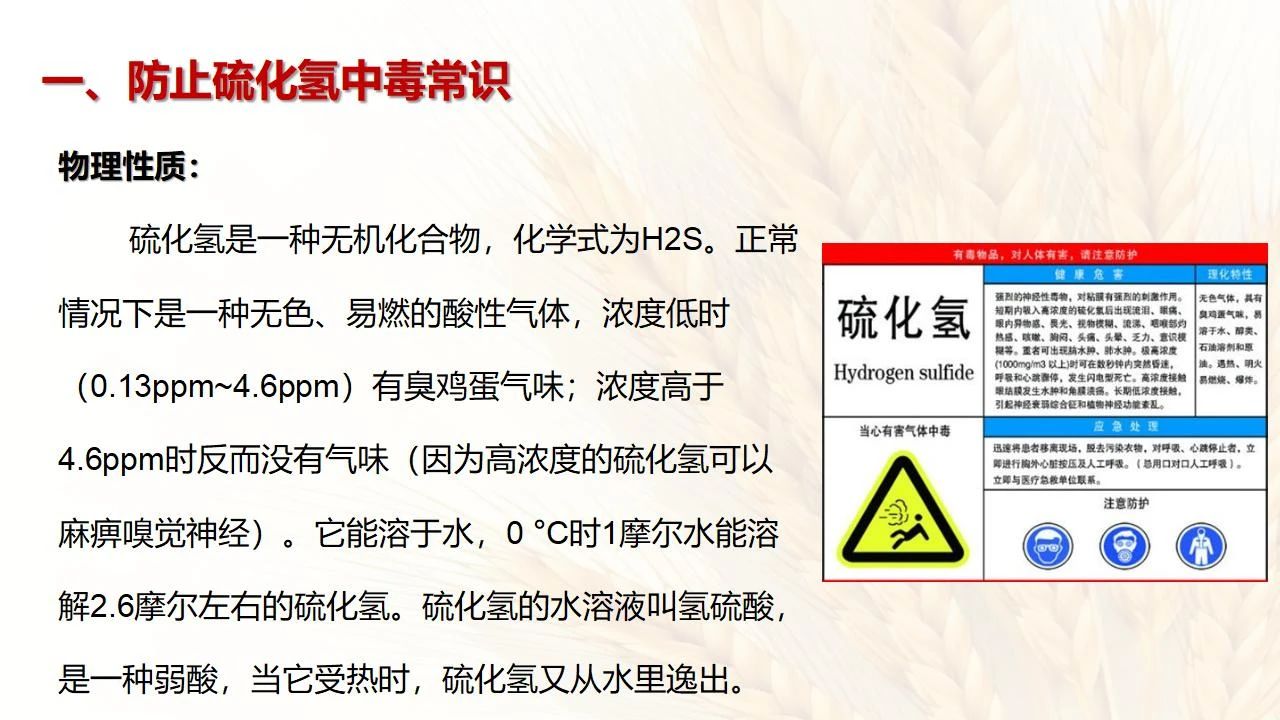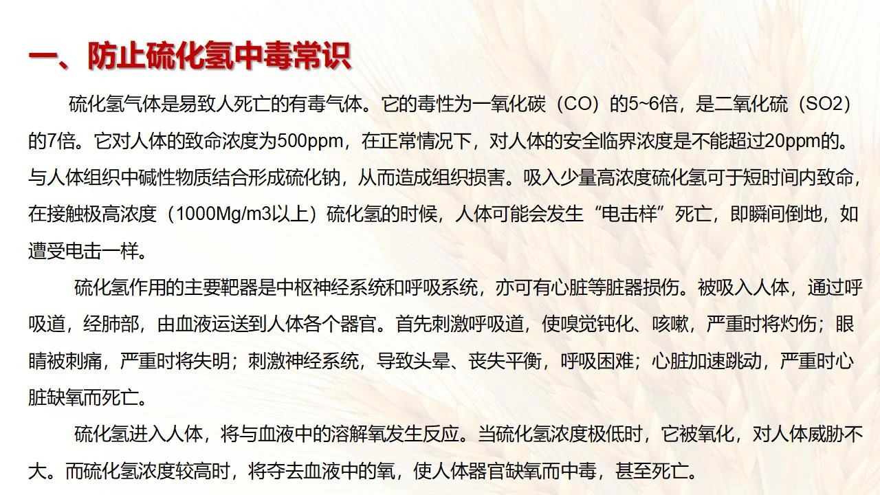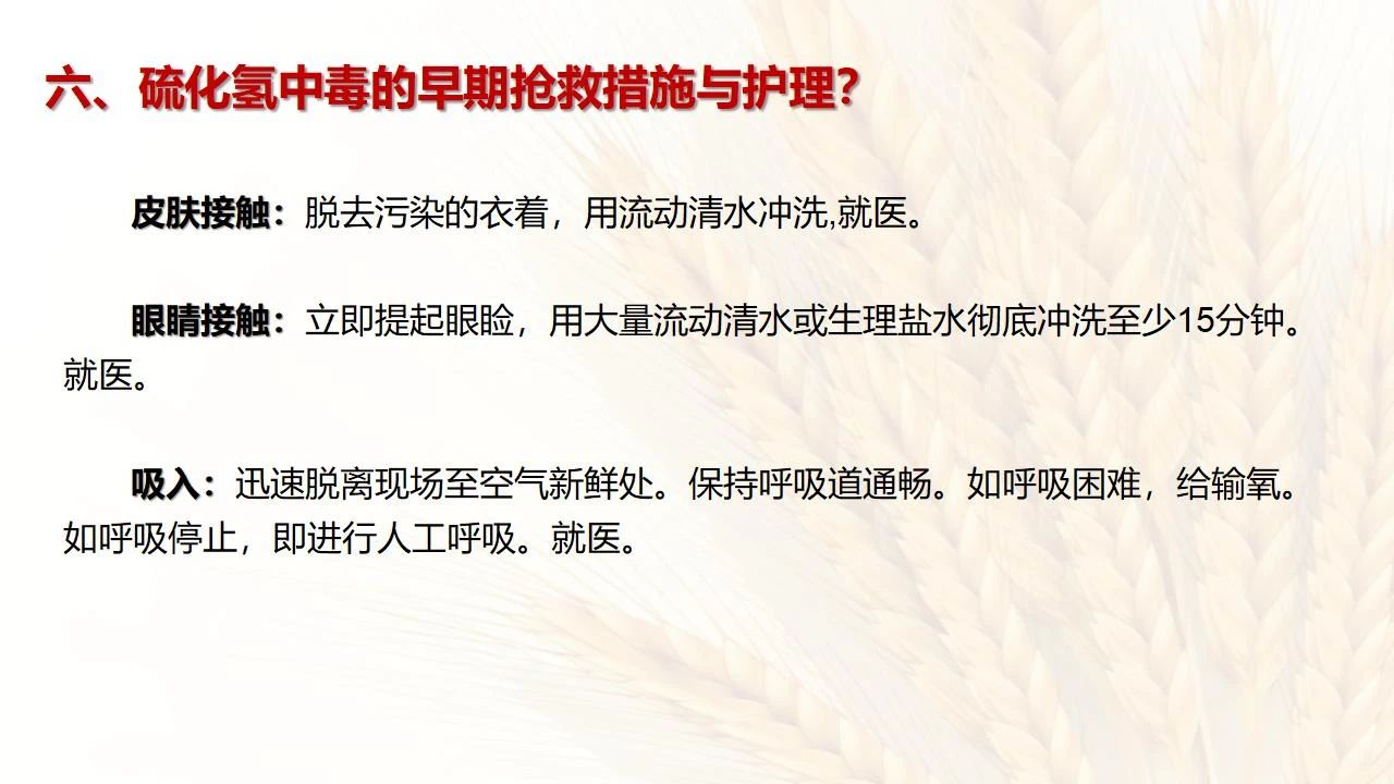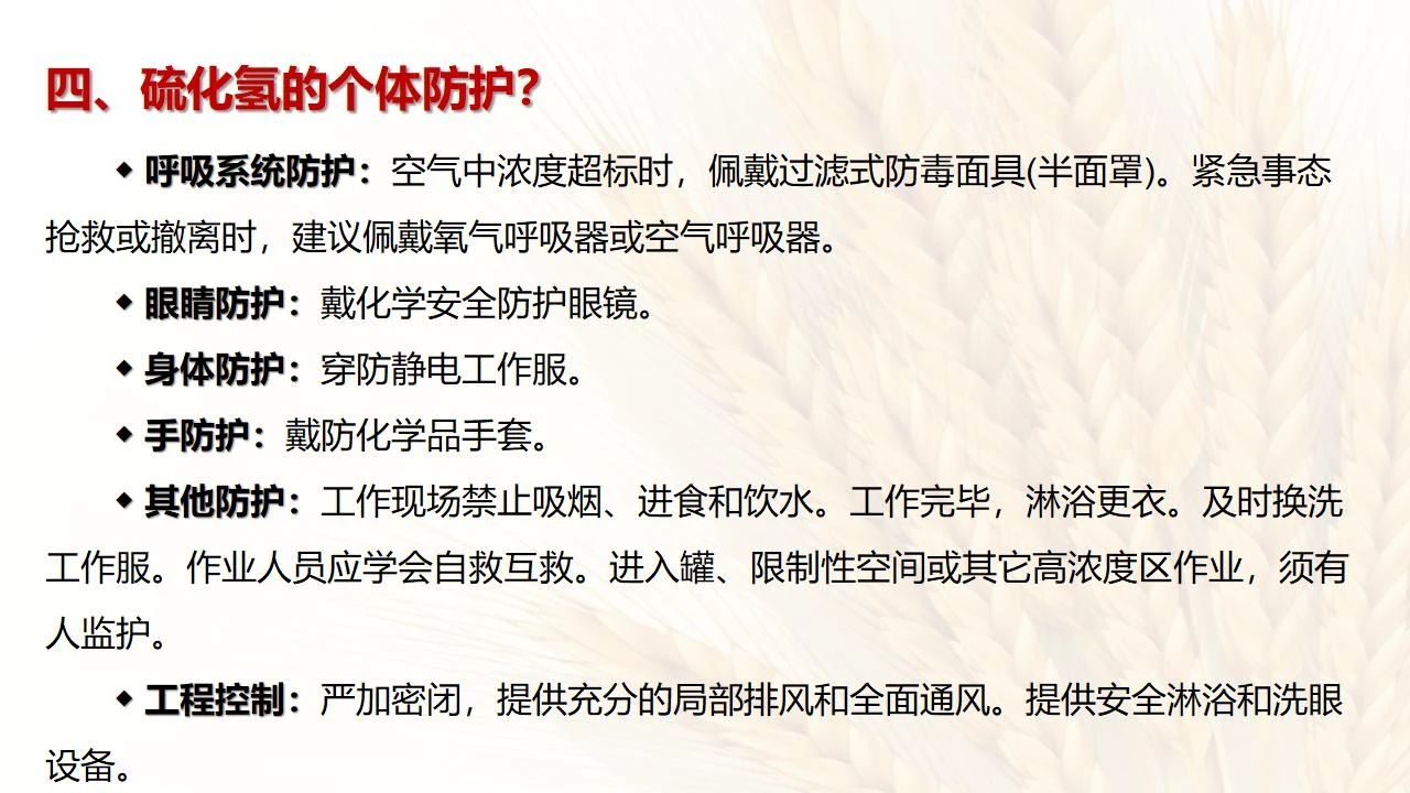 1預防措施 涉及硫化氫作業(yè)活動,必須嚴格遵守《化學品生產單位特殊作業(yè)安全規(guī)范》(GB 30871-2014)及相關的規(guī)范、標準、制度,并特別注意以下幾點: 1.產生硫化氫的生產設備應盡量密閉,并設置自動報警裝置(不能根據(jù)臭味來判斷危險場所硫化氫的濃度,硫化氫達到一定濃度時會導致嗅覺麻痹)。 2.對含有硫化氫的廢水、廢氣、廢渣,要進行凈化處理,達到排放標準后方可排放。 3.進入可能存在硫化氫的密閉容器、坑、窯、地溝等工作場所,應首先測定該場所硫化氫濃度,采取通風排毒措施,確認安全后方可操作。作業(yè)過程中應連續(xù)測定硫化氫濃度。 4.操作時做好個人防護措施,配好防毒用具(防毒面具一般為逃生自救用),作業(yè)工人腰間縛以救護帶或繩子。做好互保,要2人以上人員在場。 5.患有肝炎、腎病、氣管炎的人員不得從事接觸硫化氫作業(yè)。 6.加強員工有關專業(yè)安全知識技能的培訓,提高自我防護意識和能力。 2作業(yè)有關注意事項 (1)檢查采樣器是否完好,采用密閉取樣; (2)佩戴便攜式有毒有害(硫化氫)氣體檢測儀、適用的防毒用具,站在上風向,并有專人監(jiān)護; (3)采樣過程中手閥應慢慢打開,不要用扳手敲打閥門。 (1)佩戴便攜式有毒有害(硫化氫)氣體檢測儀、適用的防毒用具,站在上風向,并有專人監(jiān)護; (2)切水閥與切水口應有一定距離; (3)脫出的酸性氣要用氫氧化鈣或氫氧化鈉溶液中和,并有隔離措施,防止過路行人中毒; (4)切水過程中人不能離開現(xiàn)場。 需進入設備、容器進行檢修,應經過加盲板、吹掃、置換、采樣分析合格、辦理進設備容器安全作業(yè)票后,才能進入作業(yè)。但有些設備容器在檢修前,需進人排除殘余的油泥、余渣,清理過程中會散發(fā)出硫化氫和油氣等有毒有害氣體,必須做好安全措施。以下七項為設備內檢修作業(yè)步驟: (1)制定施工方案; (2)作業(yè)人員經過安全技術培訓; (3)進設備容器作業(yè)前,必須作好氣體采樣分析; (4)辦理進入受限空間安全作業(yè)票; (5)佩戴防毒用具(空呼等),攜帶好安全帶(繩); (6)作業(yè)時間不宜過長,一般不超過30min; (7)施工過程須有專人監(jiān)護,必要時應有醫(yī)務人員在場。 (1)執(zhí)行進入受限空間作業(yè)安全防護規(guī)定; (2)控制各種物料的切水排凝進入下水道; (3)采用強制通風或自然通風,保證氧含量為18%-21%,在富氧環(huán)境下不應大于23.5%; (4)配帶防毒用具(空呼等); (5)攜帶好安全帶(繩); (6)進入下水道內作業(yè)井下要設專人監(jiān)護,并與地面保持密切聯(lián)系。 (1)下油池清理前,必須用泵把污油、污水抽干凈,用高壓水沖洗置換; (2)采樣分析,根據(jù)測定結果確定施工方案和安全措施,辦理好進入受限空間作業(yè)票。 (3)配備防毒用具(空呼等),有專人監(jiān)護,必要時要攜好安全帶(繩); 設備、容器、管線存有硫化氫物料的堵漏、拆卸或安裝作業(yè)時,必須做到: (1)嚴格控制帶壓作業(yè),應把與其設備容器相通的閥門關死,安裝盲板,撤掉余壓;辦理相應安全作業(yè)票; (2)佩戴適用的防毒用具(空呼等),有專人監(jiān)護; (3)拆卸法蘭螺絲時,在松動之前,不要把螺絲全部拆開,嚴防有毒氣體大量沖出。 (1)平穩(wěn)操作,嚴防跑、冒、滴、漏; (2)裝置易泄漏或氣體易積聚的位置應安裝固定式硫化氫檢測報警器; (3)加強機泵設備的維護管理,減少泄漏; (4)可能有泄漏的地方加強通風; (5)涉及硫化氫物料的容器、管線、閥門等要定期檢查更換; (6)發(fā)現(xiàn)硫化氫濃度高,要先報告,采取一定防護措施后,才能進入現(xiàn)場檢查和處理。 (1)嚴禁在進、出油及調合過程中進行人工檢尺、測溫及拆裝安全附件等作業(yè); (2)必要的檢查、切水,操作人員應佩戴便攜式有毒有害(硫化氫)氣體檢測儀,站在上風向,并有專人監(jiān)護; (3)準備好適合的防毒面具,以便急用。 涉及有可能存在產生(逸出、外泄)硫化氫或者殘存硫化氫的清洗作業(yè)時,應事先進行風險辨識分析,并結合分析結果采取安全措施。