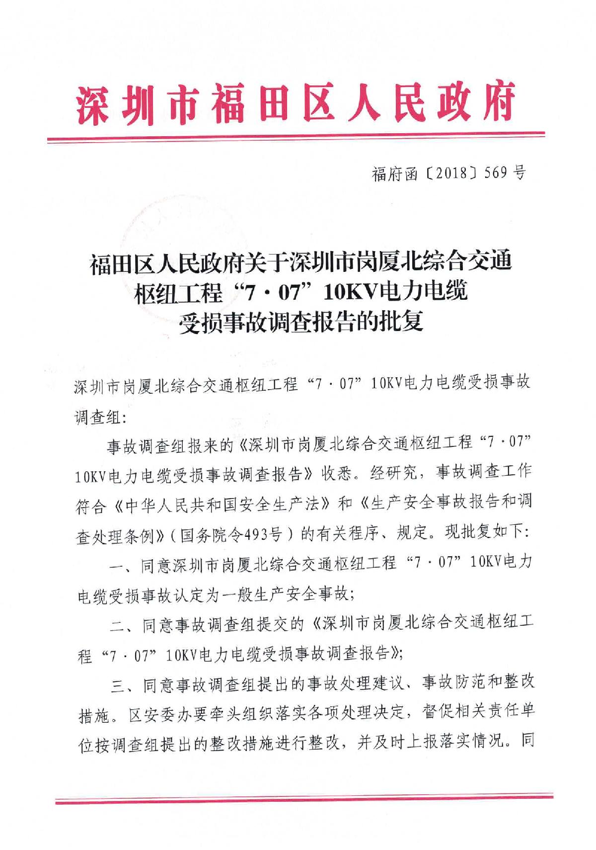 福田區(qū)人民政府關(guān)于深圳市城市軌道交通6號(hào)線二期主體工程6111標(biāo)“7.05”10kv電力電纜受損事故調(diào)查報(bào)告