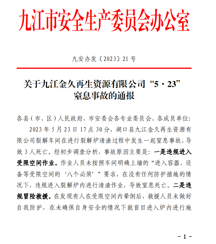 湖口縣九江金久再生資源有限公司裂解車(chē)間在進(jìn)行裂解爐清渣過(guò)程中發(fā)生一起窒息事故
