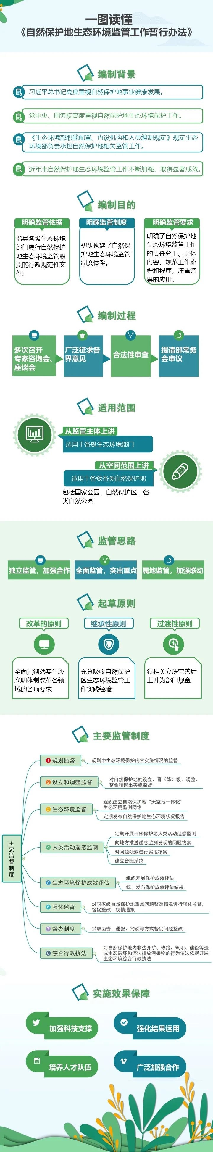 在這樣的背景下,生態(tài)環(huán)境部組織編制了《暫行辦法》,是深入貫徹習近平生態(tài)文明思想,有效落實黨中央國務院關于自然保護地事業(yè)改革各項重大部署,切實履行自然保護地生態(tài)環(huán)境監(jiān)管職責的重要舉措。其主要目的,一是明確監(jiān)管依據(jù) ,《暫行辦法》是指導各級生態(tài)環(huán)境部門履行自然保護地生態(tài)環(huán)境監(jiān)管職責的行政規(guī)范性文件;二是明確監(jiān)管制度,《暫行辦法》初步構(gòu)建了自然保護地生態(tài)環(huán)境監(jiān)管制度體系;三是明確監(jiān)管要求, 《暫行辦法》明確了自然保護地生態(tài)環(huán)境監(jiān)管工作的責任分工、具體內(nèi)容,規(guī)范工作流程和程序,注重結(jié)果的應用。